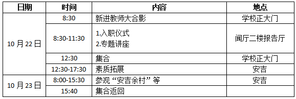 为进一步增强新教师对学校的认同感和归属感,加强新教师对职业身份的认同与职业价值的理解,学校定于10月22日召开2024年度新进专任教师入职培训暨欢迎仪式,现就有关事项通知如下: